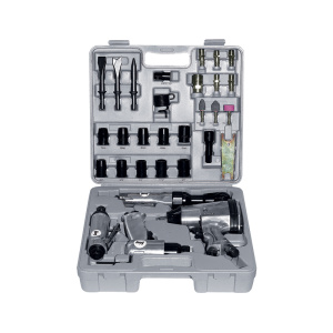 В комплект набора входят: пневмодолото, 3 зубила 120 мм с круглым хвостовиком, пневмогайковерт, 10 головок 1/2", 1 угловой пневмогайковерт, пневмошлифмашина, 3 шлифкамня 6 мм, 1 ключ шестигранный 6 мм, 1 разъем рапид муфта, 2 гаечных ключа, 1 возвратная пружина, 6 разъемов рапид штуцер, 1 удлинитель 1/2" на 75", 1 масленка, 1 переходник 3/8" на 1/2"
