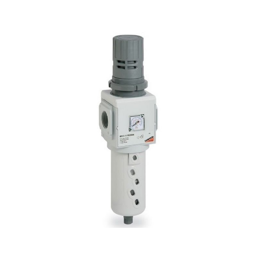 Фильтр-регулятор давления Camozzi со сбросом давления, с манометром, присоединение: G3/4", диапазон регулировки на выходе: 0,5 ... 10 бар, номинальный расход воздуха: 8000 Нл/мин, степень фильтрации: 25 мкм. Размер 2