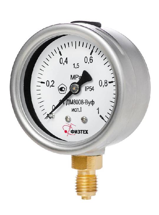 ДМ8008-ВУф исп 1 0-2,5 МПа кт.1,5 d.63 IP54 G1/4 РШ - (Виброустойчивый; Тип-ФТ; Номин.диам.корпуса-63мм; Климат.испол.-У2, диапазон t окруж.среды-от -40 до +60C°; Демпфирующая жидкость-глицерин; Без фланца, корпус-нерж.сталь, стекло-органическое, обечайка-байонет; Материал контактирующий с измер.средой-медный сплав; Макс. t измер.среды-до +120C°; Межповер.интервал-2 года; Производитель-АО "ПО Физтех", г.Томс